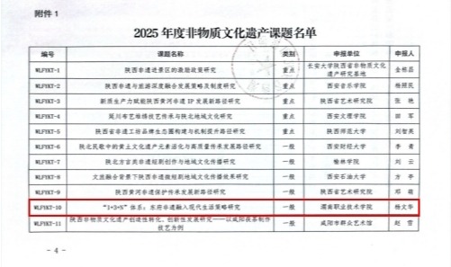 近日,陕西省文化和旅游厅公布2025年度非物质文化遗产课题立项结果,我校杨文化副教授主持的“‘1+3+N’体系:东府非遗融入现代生活策略研究”成功获批,这是我校在非遗保护与传承研究领域取得的又一重要突破。东府地区作为关中文化核心区域,承载着面辣子制作技艺等众多底蕴深厚的非遗项目,如何让...