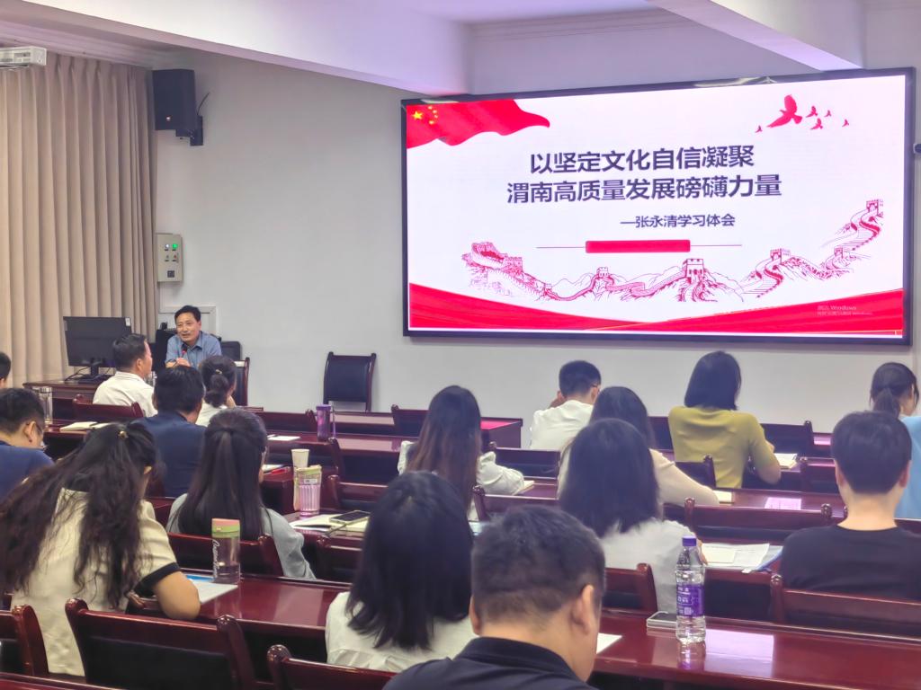 张永清以《坚定文化自信凝聚渭南高质量发展磅礴力量》为题,讲述仓颉造字,汉字演进,杜康酿酒,红色文化等地域历史和传统,结合个人成长,揭示要敬畏自然、热爱本土、自我拔节的深厚寓意。李智民以《国学经典中的人生哲学》为题,从万事万物运动变化的规律,理解国学中的哲学智慧,明透处世哲理,积蓄内修力量,增强前行动力。王天明的毛泽东诗词赏析,以独特视觉铺展毛泽东诗词,展示伟人非凡气度、宽广胸襟、大气磅礴,远见卓识的非凡才能和独特魅力。王轶英以《钟灵毓秀,下邽三贤》为题,栩栩如生、精致刻画渭南下邽三贤张仁愿、白居易、寇准的动人故事、历史地位和杰出贡献。惠夏云以《国学智慧的现实意义》和《一蓑烟雨任平生——走进苏轼》为题,讲述中华传统文化源远流长,博大精深,连绵不绝,光芒四射,有用之不尽、取之不竭的力量。系统阐释苏轼波澜壮阔的坎坷人生,逆境中安之若素,苦难中乐观豁达,值得后世永远敬仰。