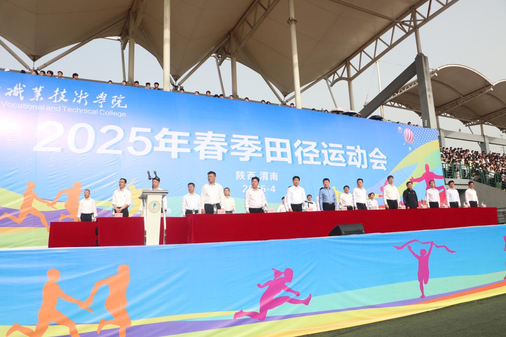 4月16日上午,高新校区田径运动场激情澎湃,学校2025年春季田径运动会在这里盛大开幕。渭南市政府副总督学、市教育局机关工会主席李忠海,渭南市体育局四级调研员王天志,学校在家领导班子成员,各二级学院党总支书记、院长,各部门负责人以及全校师生齐聚一堂,共同见证这场青春与活力的盛会。开幕式由党委副书记王录军主持。