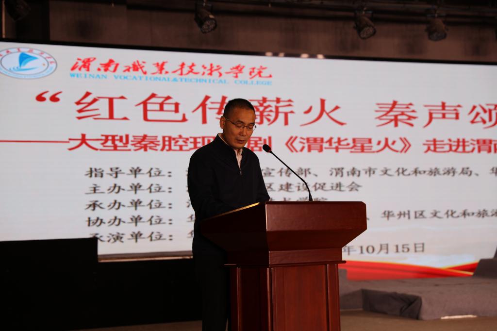 王韦华在致辞中对精心策划组织巡演的单位、倾情演出的华州区剧团及演职人员表示感谢。他指出,近年来学校深入贯彻习近平文化思想,自觉担当文化使命,坚持将红色文化基因深度融入办学治校全过程,系统构建精神传承与价值引领并重的文化育人体系。他表示,学校将以此次活动为契机,进一步推动红色文化与校园文化深度融合,教育引导广大师生从党的光辉历史中汲取砥砺奋进的力量。