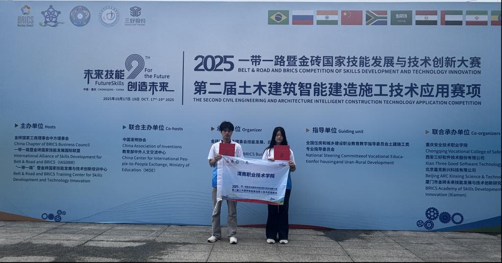 10月17日至19日,2025一带一路暨金砖国家技能发展与技术创新大赛第二届土木建筑智能建造施工技术应用赛项决赛,在重庆安全技术职业学院落下帷幕。来自全国800余所院校、近6000名师生参与选拔,覆盖范围从传统土木强校延伸至新兴开设智能建造专业的院校,最终角逐出298支队伍入围决赛。我校建筑工程学院韩朝阳、李璟瑶同学凭借扎实的专业知识和出色的实践能力,在激烈竞争中脱颖而出,荣获全国三等奖。