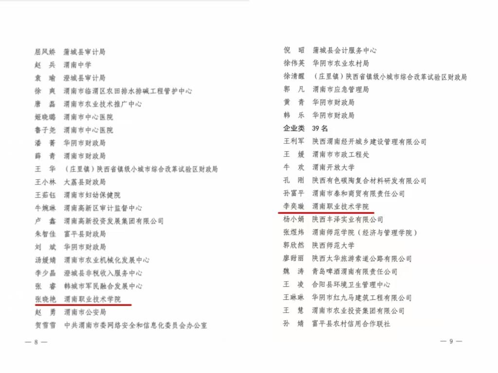 自市委组织部、市财政局、市人社局、市税务局2021年启动渭南市高层次会计人才培养提升计划以来,经本人申请和学校推荐,通过资料审核、笔试、面试等选拔程序,我校温秋红等同志被列为渭南市高层次会计人才培养对象。自2023年开始,通过连续三年集中培训、网络培训、职称学历提升、科研调研、在职自学、观摩实践“六大块”体系化培养,经过严格考核,5名同志按期完成全部培养课程,达到培养要求,被授予“渭南市高层次会计人才”称号。
