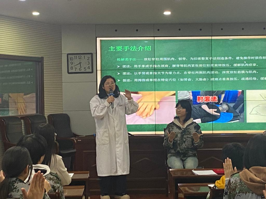 随后,刘辉老师聚焦青少年脊柱健康问题,结合中医整脊疗法的专业知识,为师生科普脊柱疾病预防要点。他通过人体模型直观展示脊柱结构,详细分析不良坐姿、长期低头等习惯对脊柱的危害,现场传授简单易行的中医整脊保健手法与拉伸动作,并针对学生常见的颈肩不适问题进行一对一指导。讲座内容兼具专业性与实用性,有效提升了学生对脊柱健康的重视程度,为守护青少年身体健康筑牢知识防线。