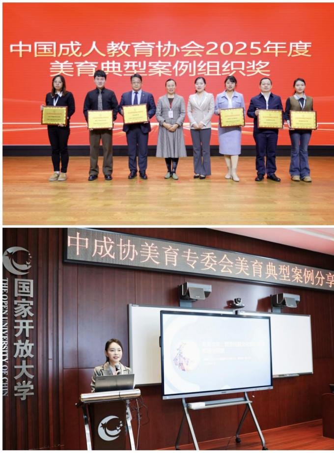 11月6日-8日,由中国成人教育协会美育专业委员会主办的“美育赋能·实践创新”研讨会在北京国家开放大学五棵松校区举行。来自全国各高校、职业院校、社会组织及美育相关领域的专家学者齐聚一堂,共话新时代美育发展路径。我校凭借扎实的美育工作基础与创新实践成果,荣获“中国成人教育协会美育典型案例优秀组织奖”。