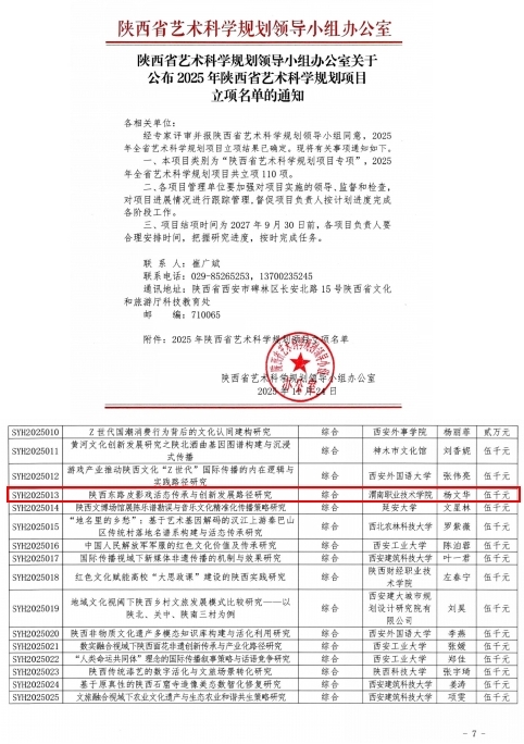 近日,陕西省文化和旅游厅公布2025年度陕西省艺术科学规划项目立项名单,我校杨文华副教授主持申报的“陕西东路皮影戏活态传承与创新发展路径”项目成功获批。这是我校在非遗保护与艺术科学研究领域的又一重要突破,标志着我校在传统文化传承创新研究方面的学术实力得到了省级权威认可。