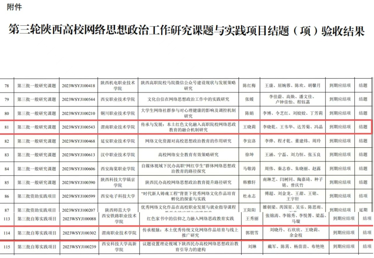 近日,中共陕西省委教育工作委员会公布第三轮陕西高校网络思想政治工作研究课题与实践项目结题(项)验收结果,我校王晓莉副教授主持的研究课题“传承与发展:本土红色文化融入高职院校网络思政教育的融合机制研究”、郭朋雪老师主持的自筹实践项目“传承根脉:本土优秀传统文化网络作品培育与线上推广研究”均顺利通过验收,成功结题(项)。