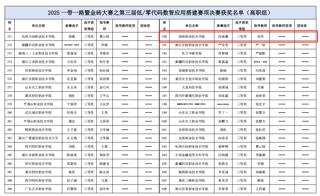 11月21日至23日,2025一带一路暨金砖国家技能发展与技术创新大赛第三届低/零代码数智应用搭建赛项决赛在四川华新现代职业学院圆满举办。大赛采用线上和线下相结合的形式进行,共吸引全国100余所院校、900多名师生参与决赛角逐。我校经济管理学院陈薇、段雨馨同学在刘丹老师的指导下,凭借扎实的专业知识与优秀的数智化实践能力,在激烈竞争中表现突出,最终荣获全国一等奖1项、三等奖1项。