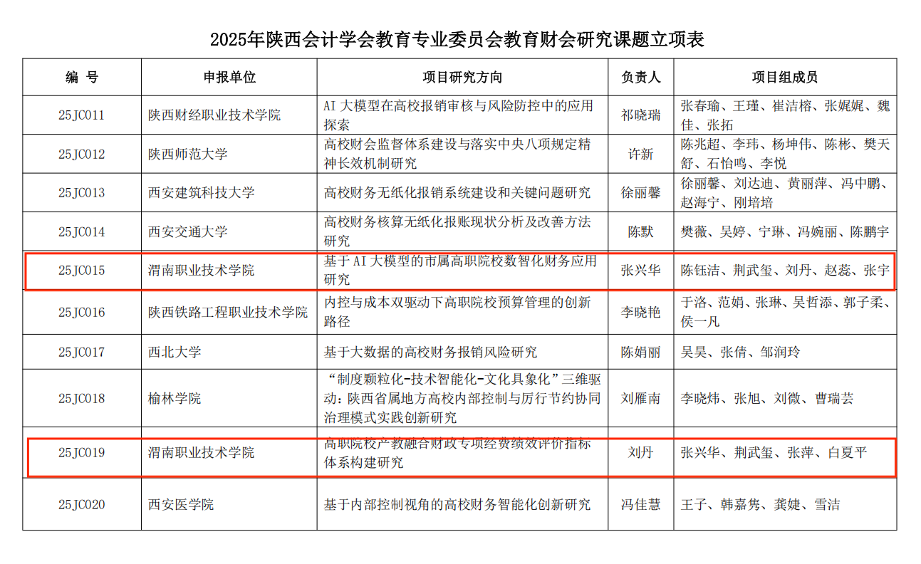 近日,陕西会计学会教育专业委员会2025年教育财会研究课题立项结果揭晓,我校喜获两项课题立项,实现我校在该学会教育财会研究课题立项上零的突破,为学校新双高建设注入新活力。