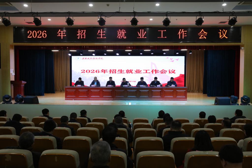1月12日下午,我校在图书馆一楼报告厅召开2026年招生就业工作会议。学校领导班子成员,副科级以上干部、全体辅导员和招生就业处全体人员参加会议。会议由校长靳华锋主持。