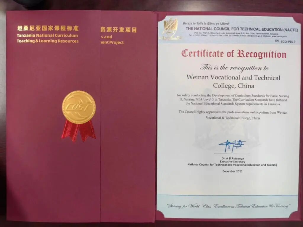 学校积极参与开发国际教学资源,为坦桑尼亚国家课程标准和课程资源开发项目建设单位,负责开发的护理专业NTA5级《护理学Ⅱ》《外科护理学Ⅱ》两门课程标准已被坦桑尼亚国家职业教育委员会审核认证,并签发认证函。