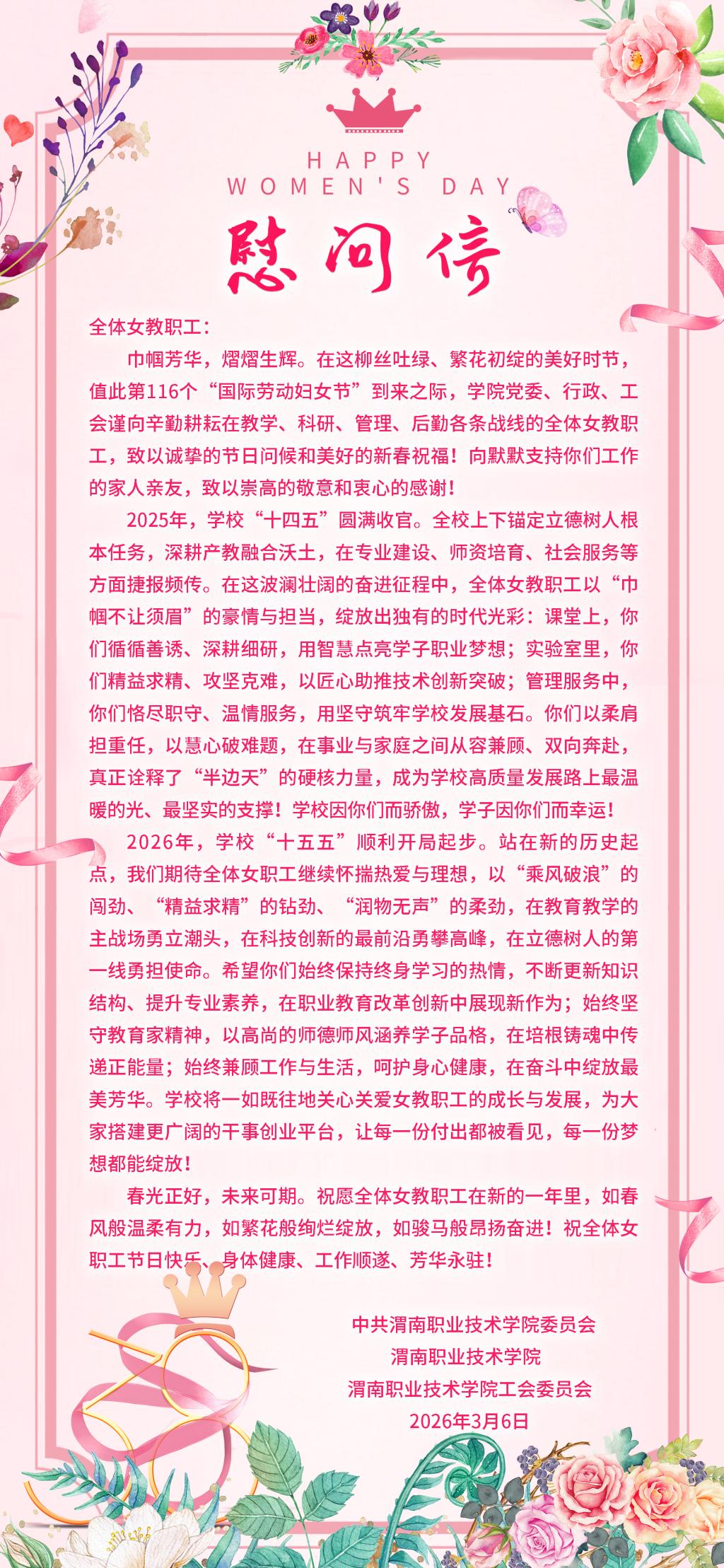 2026年,学校“十五五”顺利开局起步。站在新的历史起点,我们期待全体女职工继续怀揣热爱与理想,以“乘风破浪”的闯劲、“精益求精”的钻劲、“润物无声”的柔劲,在教育教学的主战场勇立潮头,在科技创新的最前沿勇攀高峰,在立德树人的第一线勇担使命。希望你们始终保持终身学习的热情,不断更新知识结构、提升专业素养,在职业教育改革创新中展现新作为;始终坚守教育家精神,以高尚的师德师风涵养学子品格,在培根铸魂中传递正能量;始终兼顾工作与生活,呵护身心健康,在奋斗中绽放最美芳华。学校将一如既往地关心关爱女教职工的成长与发展,为大家搭建更广阔的干事创业平台,让每一份付出都被看见,每一份梦想都能绽放!