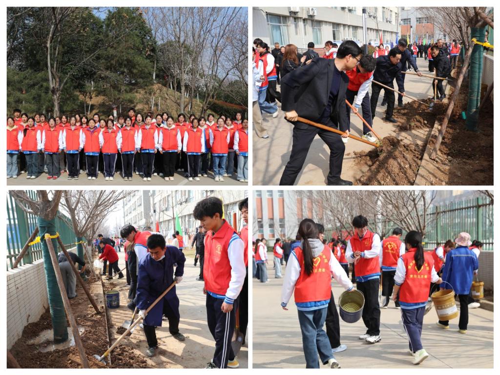 开展义务植树,共建绿色学校。青年志愿者协会在校内运输树苗、挥锹铲土、提水浇灌,用汗水浇灌绿色希望,将环保意识融入日常,以实际行动深入践行习近平生态文明思想,引导学生树立低碳生活新风和绿色生态文明理念。