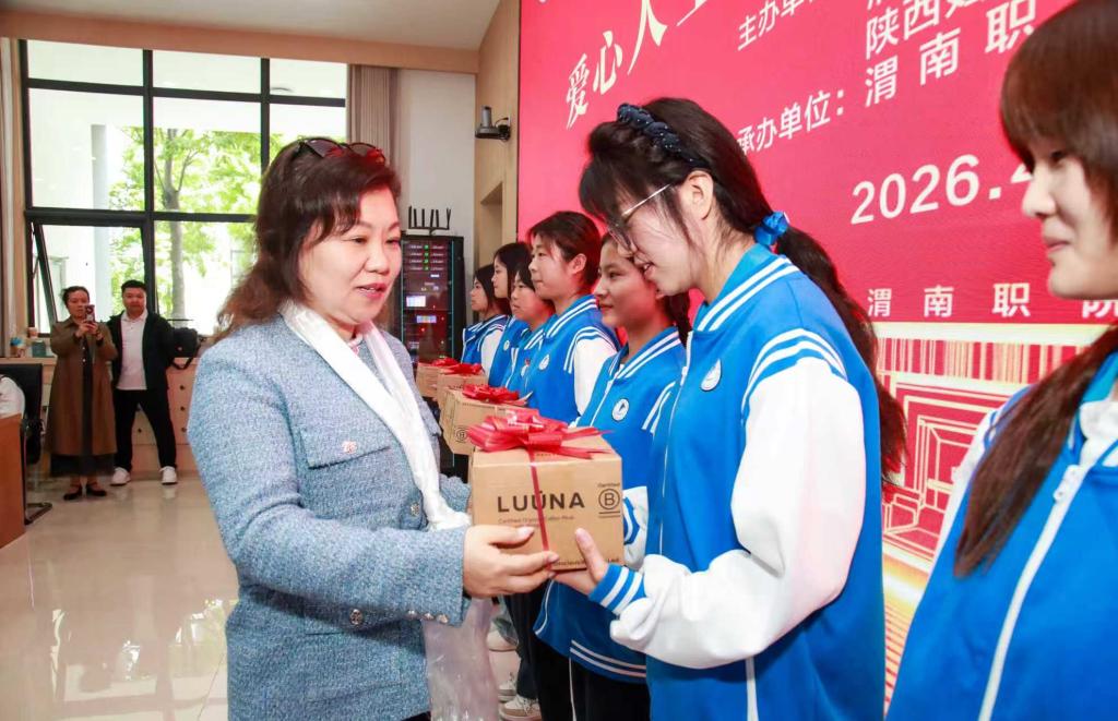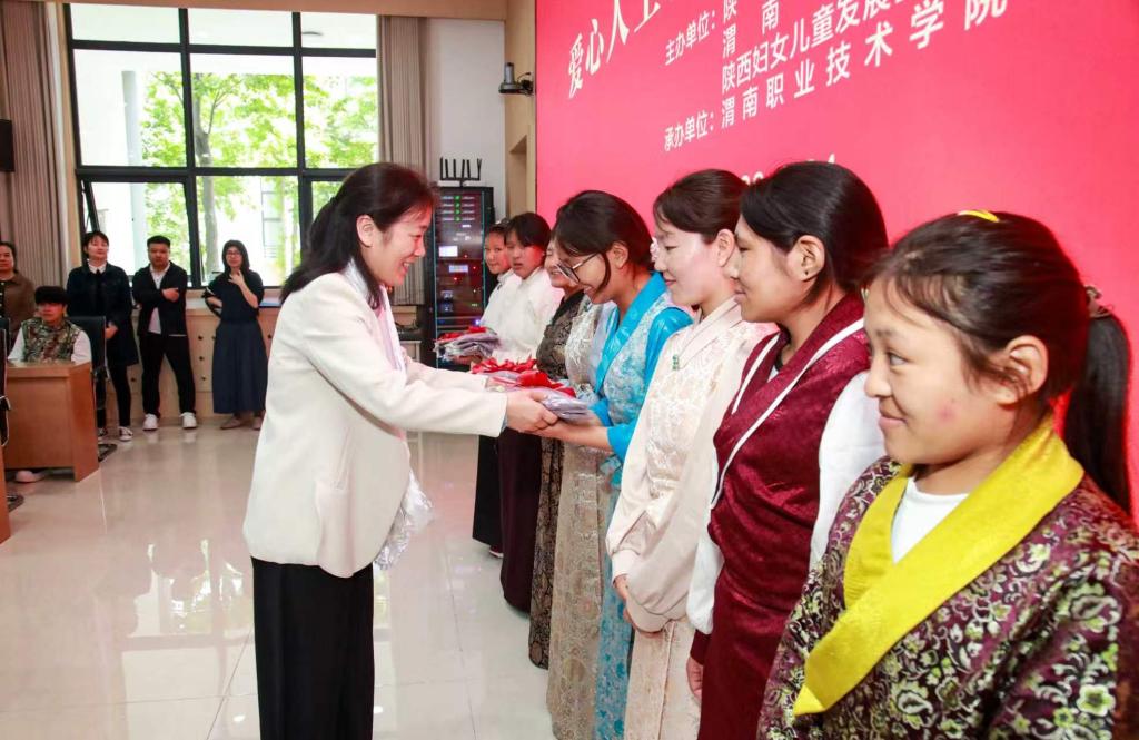 省、市妇联领导及爱心人士现场为受助学生代表发放爱心物资,一份份满载温情的物资,传递着沉甸甸的关爱,让在场学子深受感动。受助少数民族学生代表贡觉卓玛发言,她满怀感恩地表示,跨越千里来到渭南职院求学,深切感受到了校园的温暖与社会的关怀,未来定会牢记嘱托,践行民族团结要求,钻研专业技能,传承爱心善举,努力成为有理想、敢担当、能吃苦、肯奋斗的新时代青年,不辜负各界爱心人士的期望。