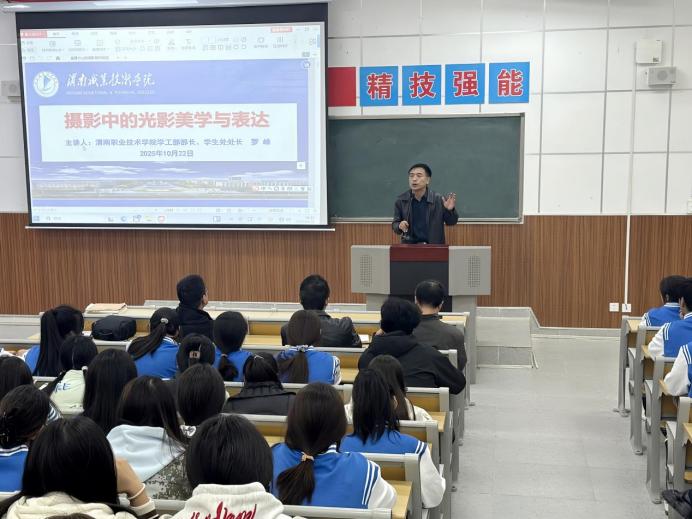 10月22日下午,美育中心在综合楼举办“青·蓝书苑”美育大讲堂第八期——《摄影中的光影美学与表达》专题讲座。学生处处长、渭南市摄影家协会副主席罗峰主讲,180余名师生参加。
