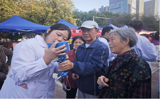 9月24日,双方联合在渭南市中心广场开展“国庆献爱心,医心护健康”大型义诊活动,将“岗位实践”融入民生服务。渭南市中心医院老年病科专家团队化身“企业导师”,围绕老年人常见慢性病管理、健康监测等智慧健康养老核心岗位需求,现场示范血压血糖检测、健康咨询沟通、科普知识宣讲等职业技能。护理学院智慧健康养老服务与管理专业学生以“准从业者”身份参与服务,在医护人员指导下完成市民血压测量、血糖检测、老年健康手册发放等工作,累计服务150余人次,发放资料200余份。