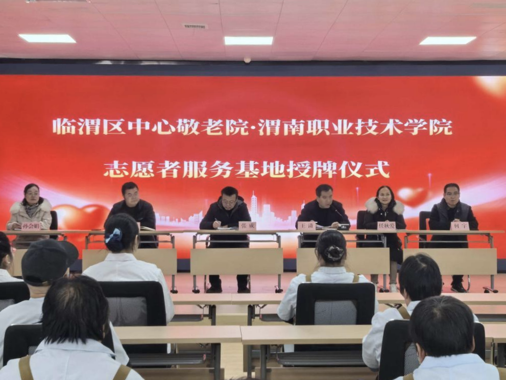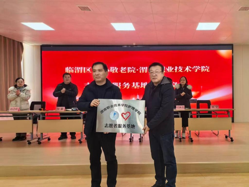为进一步加强养老服务人才队伍建设,深化校地合作与产学共赢,推动职业教育资源服务地方发展,12月16日,护理学院与临渭区中心敬老院举行“志愿者服务基地”授牌仪式暨座谈会。渭南市临渭区民政局党工委委员、副局长王潇,临渭区中心敬老院院长闵毅,护理学院院长张成、副院长任秋爱、教学科副科长孙会娟、招生就业科科长何宇参加。
