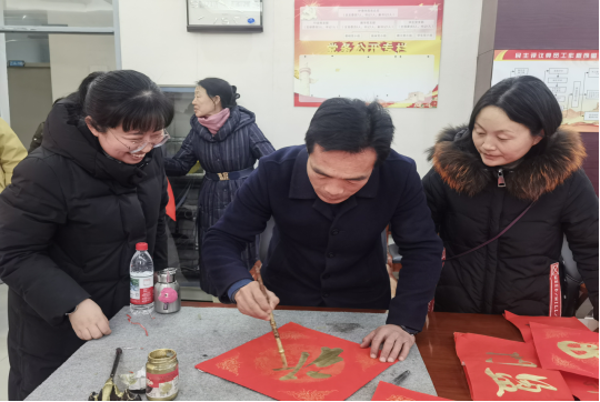 活动现场墨香四溢、喜气洋洋。教学支部的党员教师们早早地准备好了笔墨纸砚,摆好对联。党员教师郭宇森挥毫泼墨,将新春祝福融入一副副寓意吉祥的春联和“福”字之中。前来领取春联和“福”字的教师络绎不绝,他们在一幅幅作品前驻足欣赏,挑选着自己心仪的春联,脸上都洋溢着幸福的笑容。