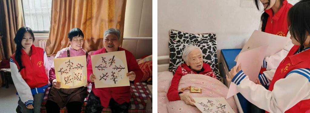 活动现场气氛温馨热烈,师生同台献艺,精彩纷呈:舞蹈《立春》以曼妙舞姿勾勒春日蓬勃生机,《家有儿女》则用灵动舞步诠释亲情陪伴的温情;歌曲《稻香》唤起记忆中的田园诗意,《我只在乎你》以悠扬旋律倾诉真挚情感,共同传递温暖与感动。在趣味互动环节,师生带领老人们做手指操、绘制棉签创意画,老人们专注创作,一幅幅色彩斑斓的作品展现出对生活的热爱。活动尾声,师生分组探望行动不便的老人,将完成的画作送到床前,闲话家常、问询近况,细致的关怀让老人们倍感温暖。